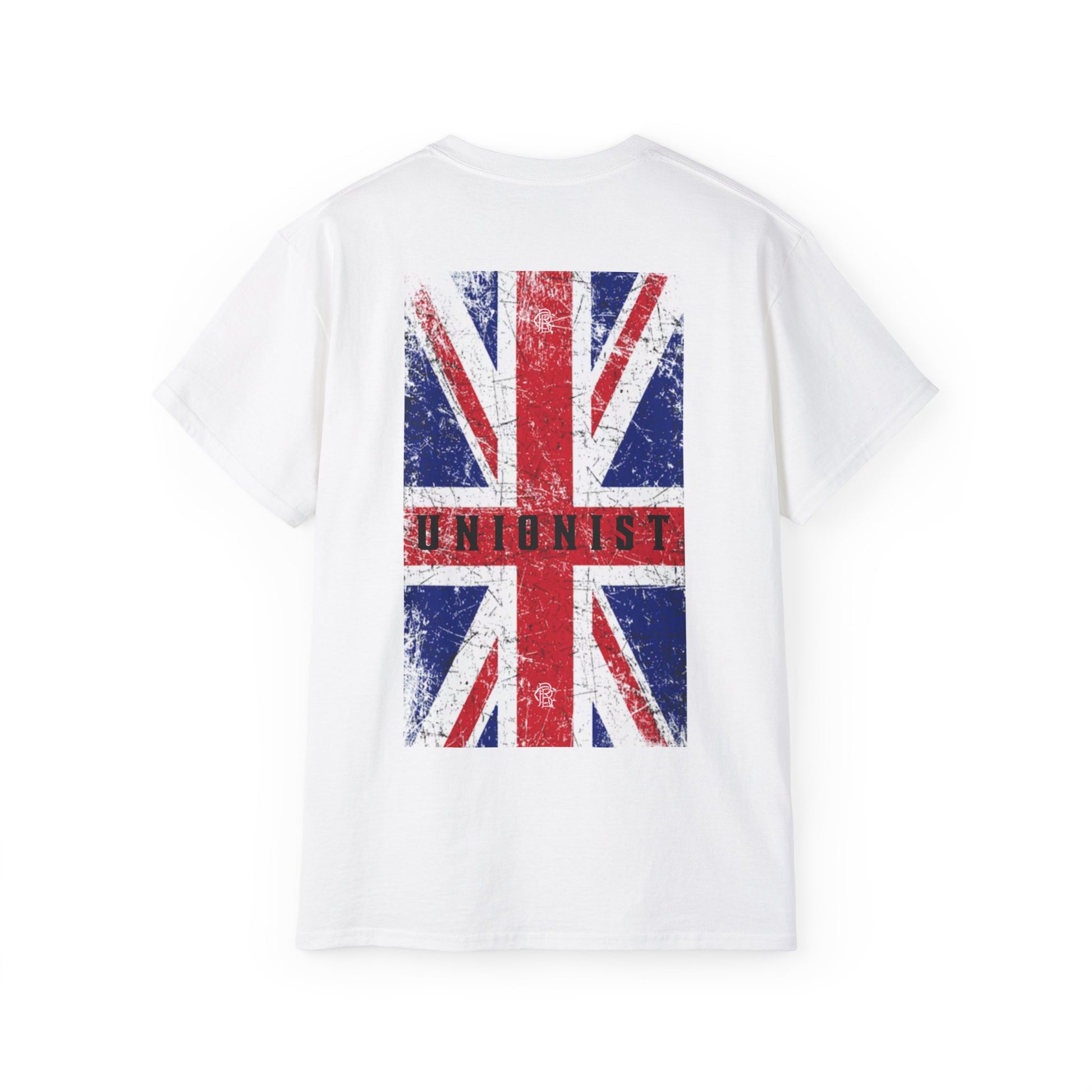 Embrace your bold and adventurous side with the Unionist back print cotton T-shirt. Featuring a striking Royal Blue Clothing logo on the front and a Union Jack with the term "unionist" on the back, this tee proudly celebrates your British pride. Show the world your daring spirit and love for your country with this statement piece.